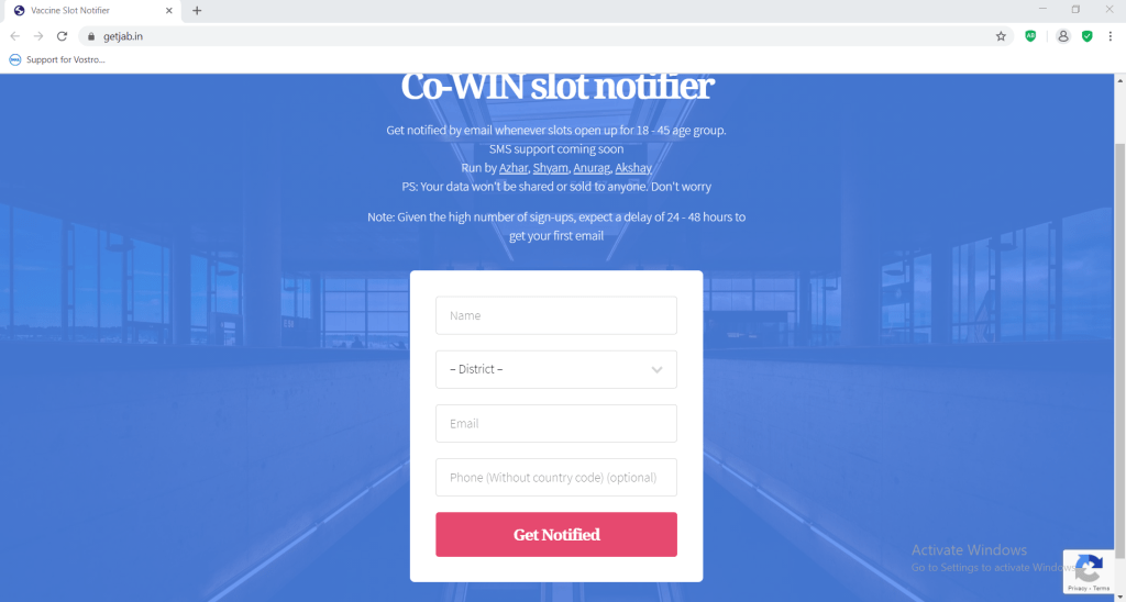 The official site of the Indian government to register for a vaccination dose is cowin.gov.in although this website shows us that slots are full , it doesn’t update us when a particular slot is available . Many people are working from home and they can’t spend their whole day just looking for the update on the slots.
